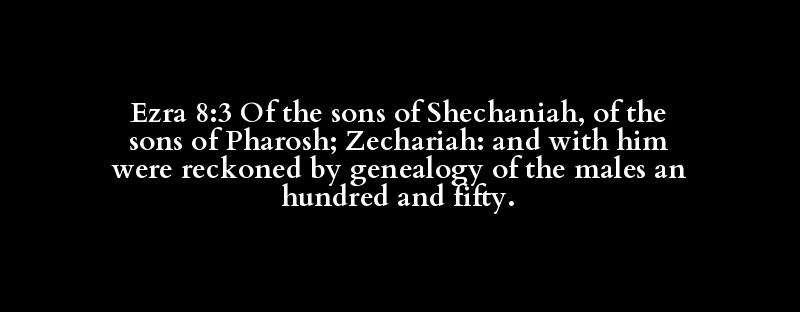 Ezra 8:3 Of the sons of Shechaniah, of the sons of Pharosh; Zechariah: and with him were reckoned by genealogy of the males an hundred and fifty.