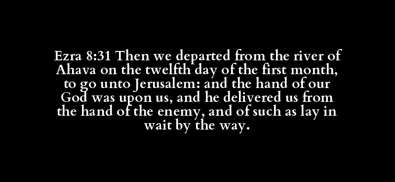 Ezra 8:31 Then we departed from the river of Ahava on the twelfth day of the first month, to go unto Jerusalem: and the hand of our God was upon us, and he delivered us from the hand of the enemy, and of such as lay in wait by the way.