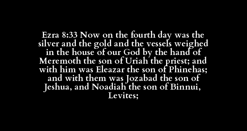 Ezra 8:33 Now on the fourth day was the silver and the gold and the vessels weighed in the house of our God by the hand of Meremoth the son of Uriah the priest; and with him was Eleazar the son of Phinehas; and with them was Jozabad the son of Jeshua, and Noadiah the son of Binnui, Levites;