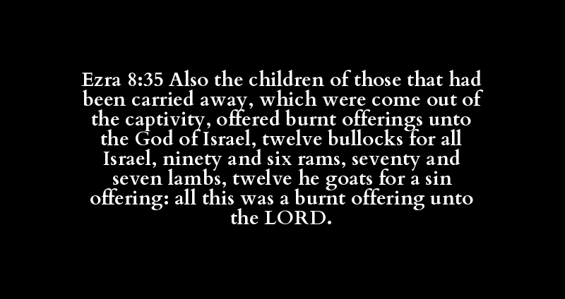 Ezra 8:35 Also the children of those that had been carried away, which were come out of the captivity, offered burnt offerings unto the God of Israel, twelve bullocks for all Israel, ninety and six rams, seventy and seven lambs, twelve he goats for a sin offering: all this was a burnt offering unto the LORD.