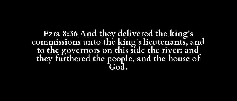 Ezra 8:36 And they delivered the king's commissions unto the king's lieutenants, and to the governors on this side the river: and they furthered the people, and the house of God.
