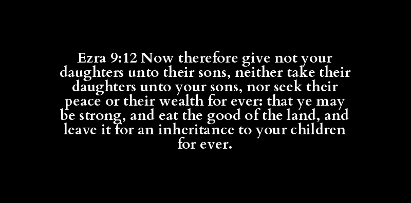 Ezra 9:12 Now therefore give not your daughters unto their sons, neither take their daughters unto your sons, nor seek their peace or their wealth for ever: that ye may be strong, and eat the good of the land, and leave it for an inheritance to your children for ever.