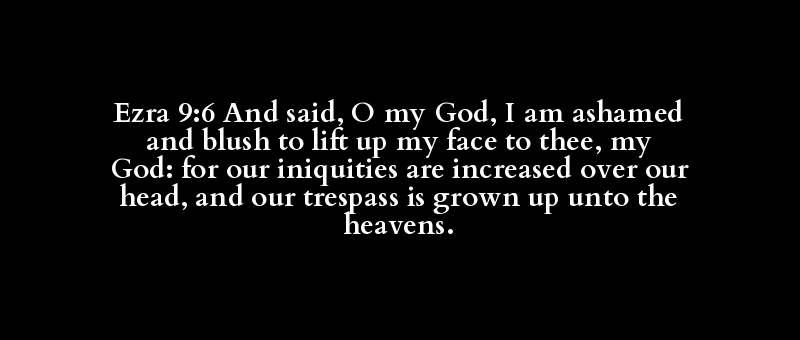Ezra 9:6 And said, O my God, I am ashamed and blush to lift up my face to thee, my God: for our iniquities are increased over our head, and our trespass is grown up unto the heavens.