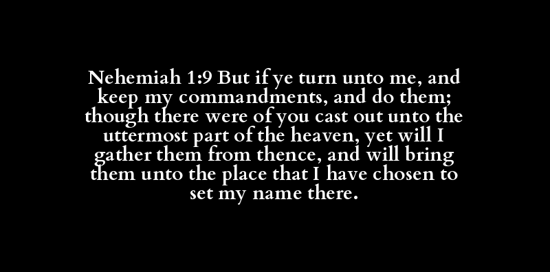 Nehemiah 1:9 But if ye turn unto me, and keep my commandments, and do them; though there were of you cast out unto the uttermost part of the heaven, yet will I gather them from thence, and will bring them unto the place that I have chosen to set my name there.