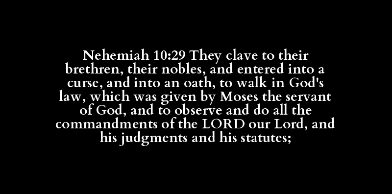 Nehemiah 10:29 They clave to their brethren, their nobles, and entered into a curse, and into an oath, to walk in God's law, which was given by Moses the servant of God, and to observe and do all the commandments of the LORD our Lord, and his judgments and his statutes;