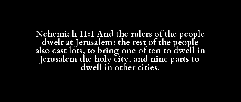 Nehemiah 11:1 And the rulers of the people dwelt at Jerusalem: the rest of the people also cast lots, to bring one of ten to dwell in Jerusalem the holy city, and nine parts to dwell in other cities.