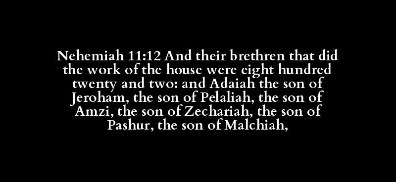 Nehemiah 11:12 And their brethren that did the work of the house were eight hundred twenty and two: and Adaiah the son of Jeroham, the son of Pelaliah, the son of Amzi, the son of Zechariah, the son of Pashur, the son of Malchiah,