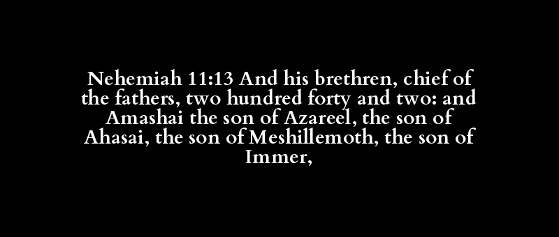 Nehemiah 11:13 And his brethren, chief of the fathers, two hundred forty and two: and Amashai the son of Azareel, the son of Ahasai, the son of Meshillemoth, the son of Immer,