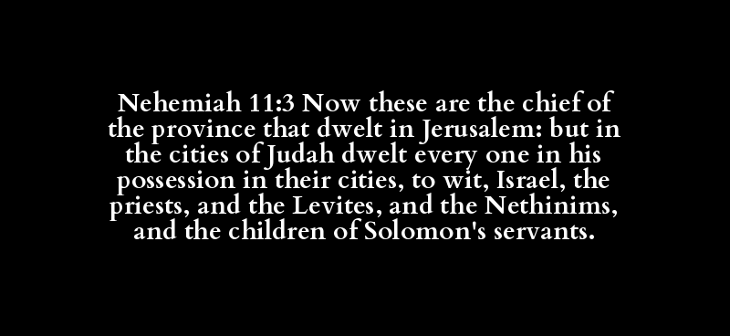 Nehemiah 11:3 Now these are the chief of the province that dwelt in Jerusalem: but in the cities of Judah dwelt every one in his possession in their cities, to wit, Israel, the priests, and the Levites, and the Nethinims, and the children of Solomon's servants.