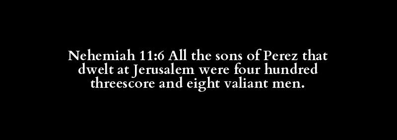Nehemiah 11:6 All the sons of Perez that dwelt at Jerusalem were four hundred threescore and eight valiant men.