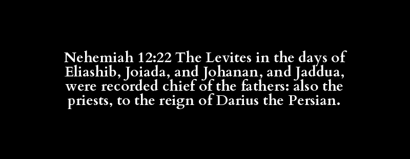 Nehemiah 12:22 The Levites in the days of Eliashib, Joiada, and Johanan, and Jaddua, were recorded chief of the fathers: also the priests, to the reign of Darius the Persian.