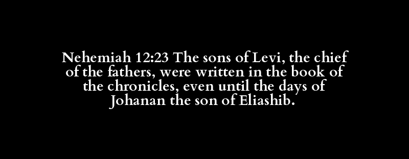 Nehemiah 12:23 The sons of Levi, the chief of the fathers, were written in the book of the chronicles, even until the days of Johanan the son of Eliashib.