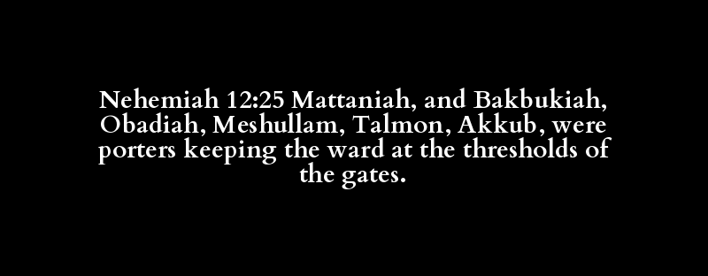 Nehemiah 12:25 Mattaniah, and Bakbukiah, Obadiah, Meshullam, Talmon, Akkub, were porters keeping the ward at the thresholds of the gates.