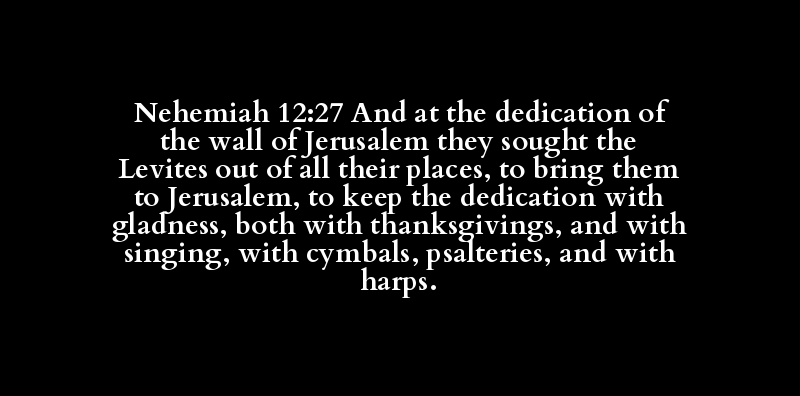 Nehemiah 12:27 And at the dedication of the wall of Jerusalem they sought the Levites out of all their places, to bring them to Jerusalem, to keep the dedication with gladness, both with thanksgivings, and with singing, with cymbals, psalteries, and with harps.