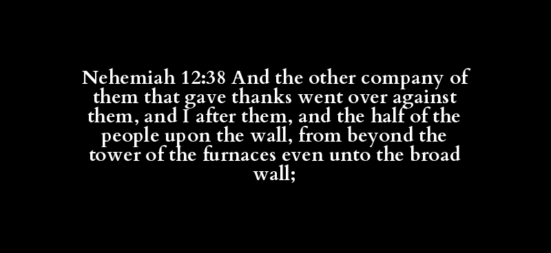 Nehemiah 12:38 And the other company of them that gave thanks went over against them, and I after them, and the half of the people upon the wall, from beyond the tower of the furnaces even unto the broad wall;