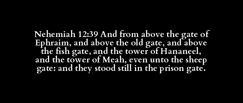 Nehemiah 12:39 And from above the gate of Ephraim, and above the old gate, and above the fish gate, and the tower of Hananeel, and the tower of Meah, even unto the sheep gate: and they stood still in the prison gate.