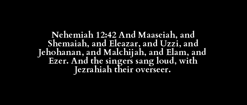 Nehemiah 12:42 And Maaseiah, and Shemaiah, and Eleazar, and Uzzi, and Jehohanan, and Malchijah, and Elam, and Ezer. And the singers sang loud, with Jezrahiah their overseer.