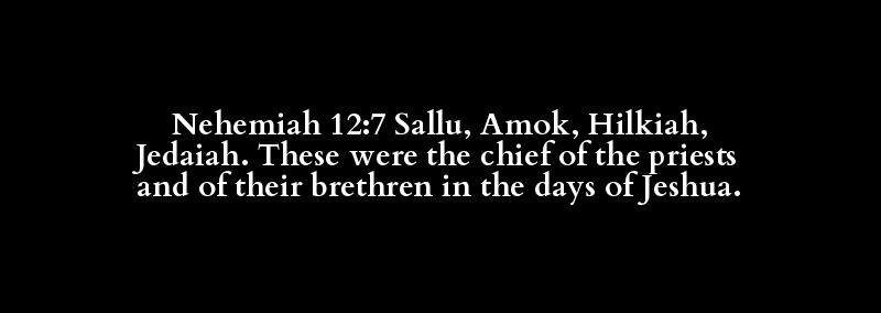 Nehemiah 12:7 Sallu, Amok, Hilkiah, Jedaiah. These were the chief of the priests and of their brethren in the days of Jeshua.