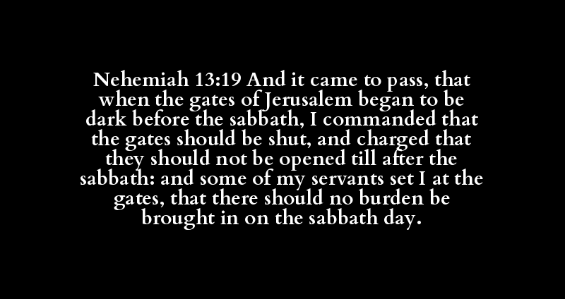 Nehemiah 13:19 And it came to pass, that when the gates of Jerusalem began to be dark before the sabbath, I commanded that the gates should be shut, and charged that they should not be opened till after the sabbath: and some of my servants set I at the gates, that there should no burden be brought in on the sabbath day.