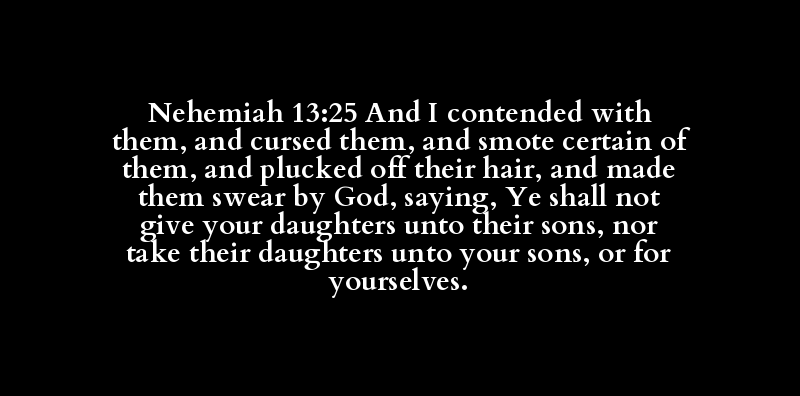 Nehemiah 13:25 And I contended with them, and cursed them, and smote certain of them, and plucked off their hair, and made them swear by God, saying, Ye shall not give your daughters unto their sons, nor take their daughters unto your sons, or for yourselves.