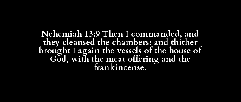 Nehemiah 13:9 Then I commanded, and they cleansed the chambers: and thither brought I again the vessels of the house of God, with the meat offering and the frankincense.
