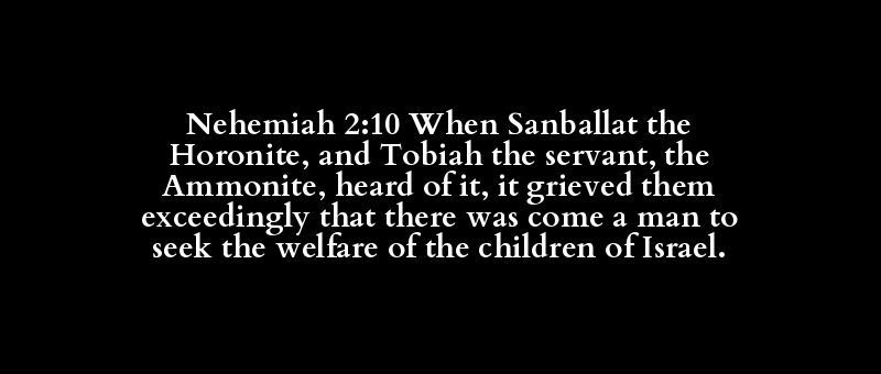 Nehemiah 2:10 When Sanballat the Horonite, and Tobiah the servant, the Ammonite, heard of it, it grieved them exceedingly that there was come a man to seek the welfare of the children of Israel.