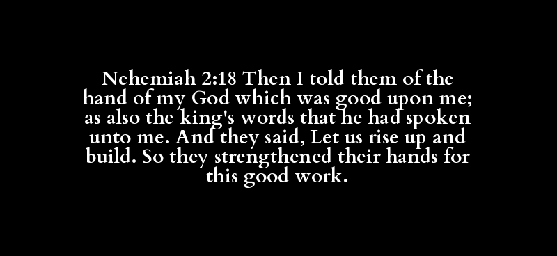 Nehemiah 2:18 Then I told them of the hand of my God which was good upon me; as also the king's words that he had spoken unto me. And they said, Let us rise up and build. So they strengthened their hands for this good work.