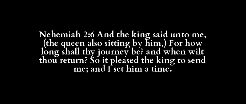 Nehemiah 2:6 And the king said unto me, (the queen also sitting by him,) For how long shall thy journey be? and when wilt thou return? So it pleased the king to send me; and I set him a time.