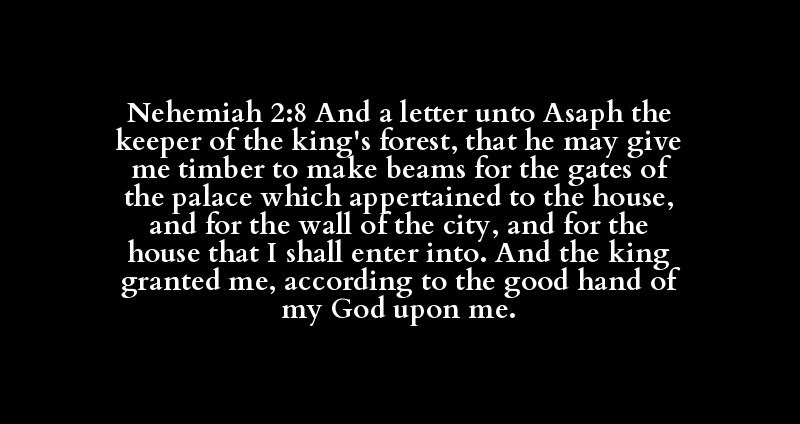 Nehemiah 2:8 And a letter unto Asaph the keeper of the king's forest, that he may give me timber to make beams for the gates of the palace which appertained to the house, and for the wall of the city, and for the house that I shall enter into. And the king granted me, according to the good hand of my God upon me.