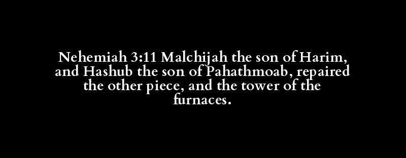 Nehemiah 3:11 Malchijah the son of Harim, and Hashub the son of Pahathmoab, repaired the other piece, and the tower of the furnaces.