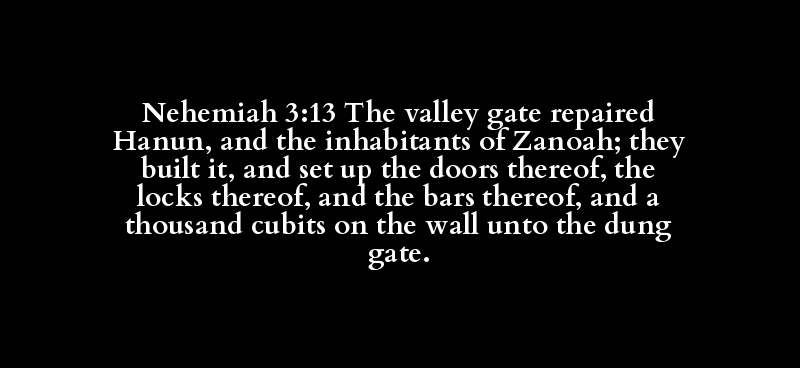 Nehemiah 3:13 The valley gate repaired Hanun, and the inhabitants of Zanoah; they built it, and set up the doors thereof, the locks thereof, and the bars thereof, and a thousand cubits on the wall unto the dung gate.