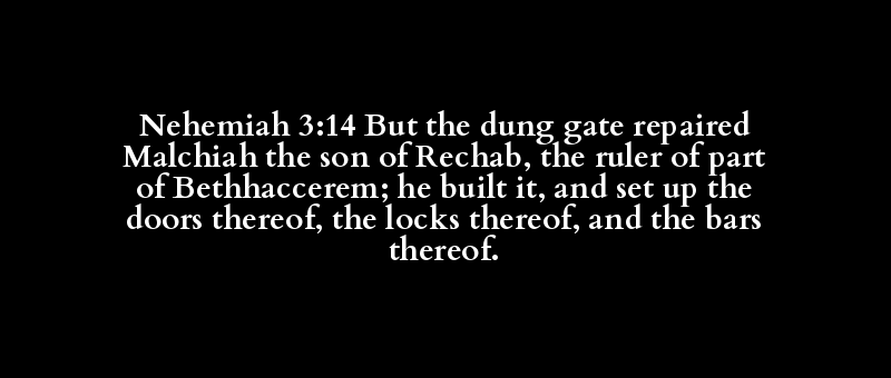 Nehemiah 3:14 But the dung gate repaired Malchiah the son of Rechab, the ruler of part of Bethhaccerem; he built it, and set up the doors thereof, the locks thereof, and the bars thereof.