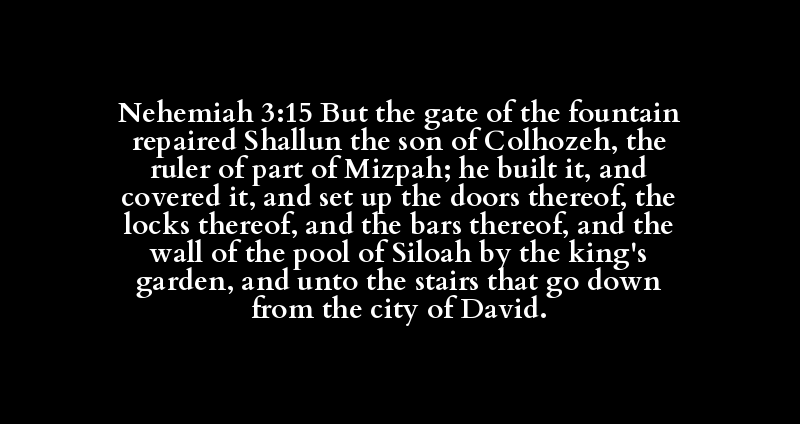 Nehemiah 3:15 But the gate of the fountain repaired Shallun the son of Colhozeh, the ruler of part of Mizpah; he built it, and covered it, and set up the doors thereof, the locks thereof, and the bars thereof, and the wall of the pool of Siloah by the king's garden, and unto the stairs that go down from the city of David.