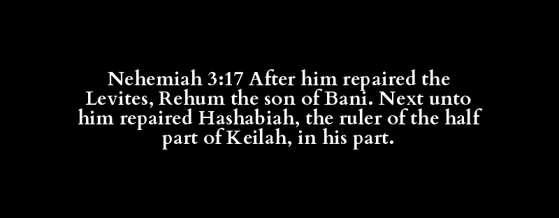 Nehemiah 3:17 After him repaired the Levites, Rehum the son of Bani. Next unto him repaired Hashabiah, the ruler of the half part of Keilah, in his part.