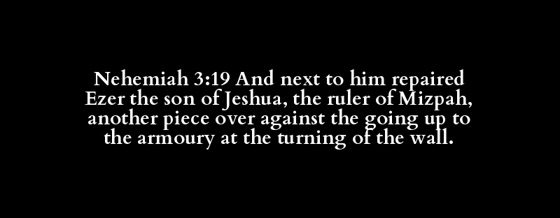 Nehemiah 3:19 And next to him repaired Ezer the son of Jeshua, the ruler of Mizpah, another piece over against the going up to the armoury at the turning of the wall.