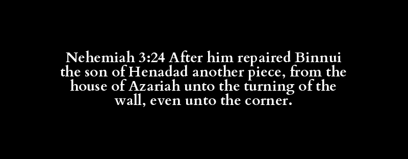 Nehemiah 3:24 After him repaired Binnui the son of Henadad another piece, from the house of Azariah unto the turning of the wall, even unto the corner.
