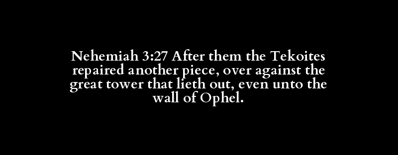 Nehemiah 3:27 After them the Tekoites repaired another piece, over against the great tower that lieth out, even unto the wall of Ophel.