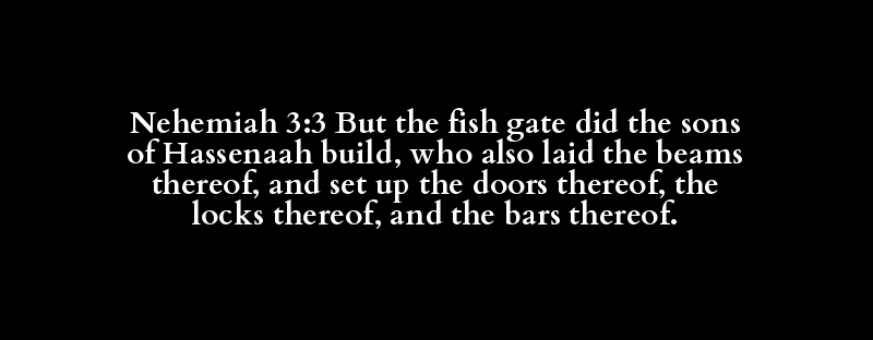 Nehemiah 3:3 But the fish gate did the sons of Hassenaah build, who also laid the beams thereof, and set up the doors thereof, the locks thereof, and the bars thereof.