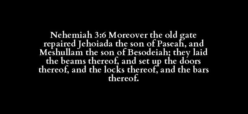 Nehemiah 3:6 Moreover the old gate repaired Jehoiada the son of Paseah, and Meshullam the son of Besodeiah; they laid the beams thereof, and set up the doors thereof, and the locks thereof, and the bars thereof.