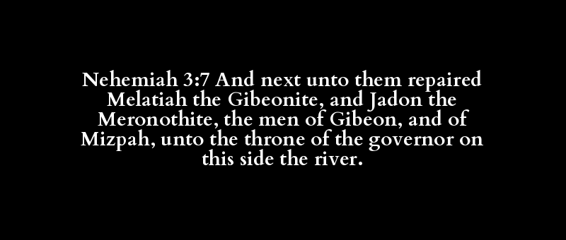 Nehemiah 3:7 And next unto them repaired Melatiah the Gibeonite, and Jadon the Meronothite, the men of Gibeon, and of Mizpah, unto the throne of the governor on this side the river.