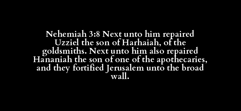 Nehemiah 3:8 Next unto him repaired Uzziel the son of Harhaiah, of the goldsmiths. Next unto him also repaired Hananiah the son of one of the apothecaries, and they fortified Jerusalem unto the broad wall.