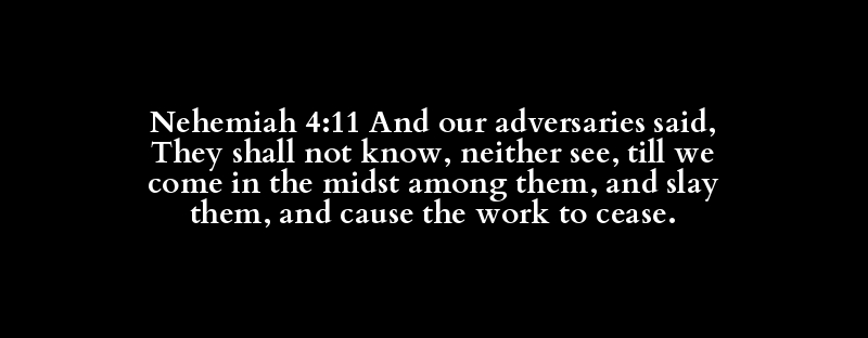 Nehemiah 4:11 And our adversaries said, They shall not know, neither see, till we come in the midst among them, and slay them, and cause the work to cease.