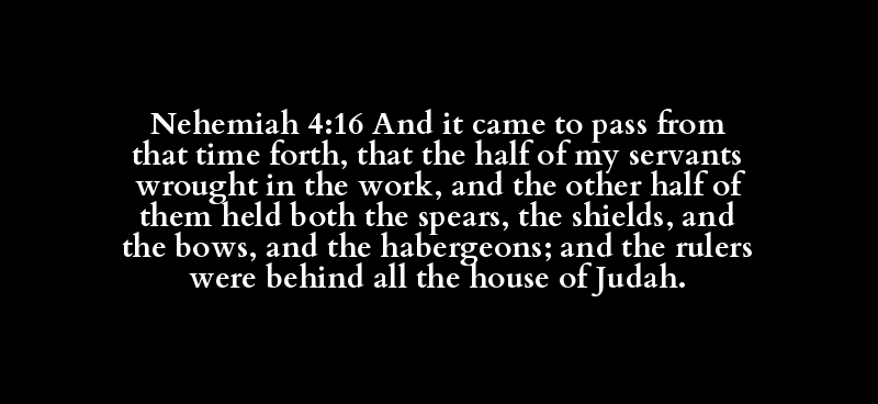 Nehemiah 4:16 And it came to pass from that time forth, that the half of my servants wrought in the work, and the other half of them held both the spears, the shields, and the bows, and the habergeons; and the rulers were behind all the house of Judah.