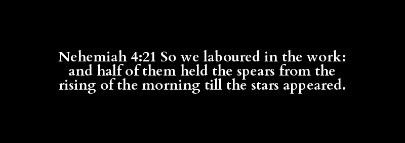 Nehemiah 4:21 So we laboured in the work: and half of them held the spears from the rising of the morning till the stars appeared.