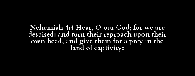 Nehemiah 4:4 Hear, O our God; for we are despised: and turn their reproach upon their own head, and give them for a prey in the land of captivity: