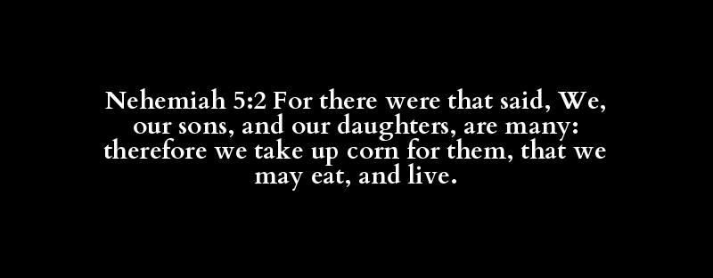 Nehemiah 5:2 For there were that said, We, our sons, and our daughters, are many: therefore we take up corn for them, that we may eat, and live.