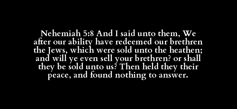 Nehemiah 5:8 And I said unto them, We after our ability have redeemed our brethren the Jews, which were sold unto the heathen; and will ye even sell your brethren? or shall they be sold unto us? Then held they their peace, and found nothing to answer.