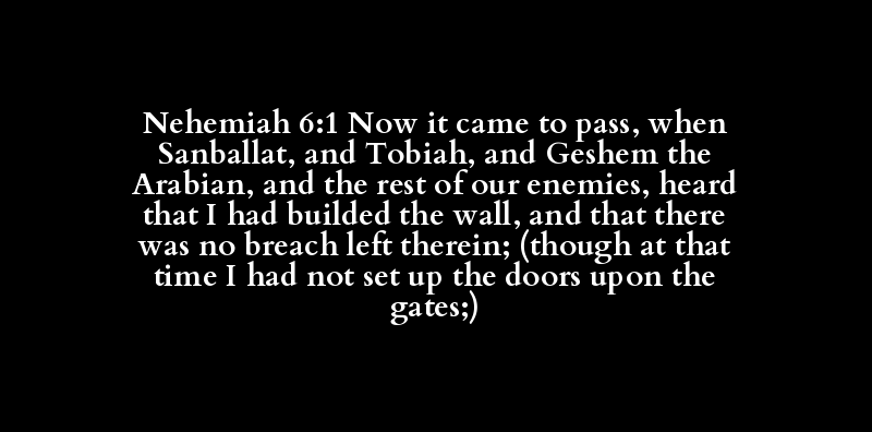 Nehemiah 6:1 Now it came to pass, when Sanballat, and Tobiah, and Geshem the Arabian, and the rest of our enemies, heard that I had builded the wall, and that there was no breach left therein; (though at that time I had not set up the doors upon the gates;)