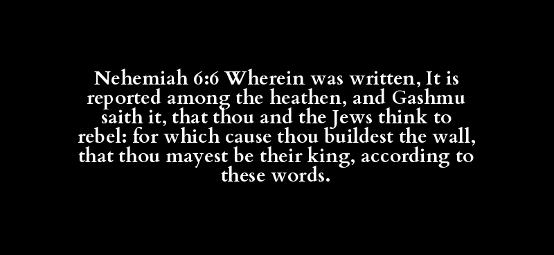 Nehemiah 6:6 Wherein was written, It is reported among the heathen, and Gashmu saith it, that thou and the Jews think to rebel: for which cause thou buildest the wall, that thou mayest be their king, according to these words.
