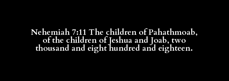 Nehemiah 7:11 The children of Pahathmoab, of the children of Jeshua and Joab, two thousand and eight hundred and eighteen.